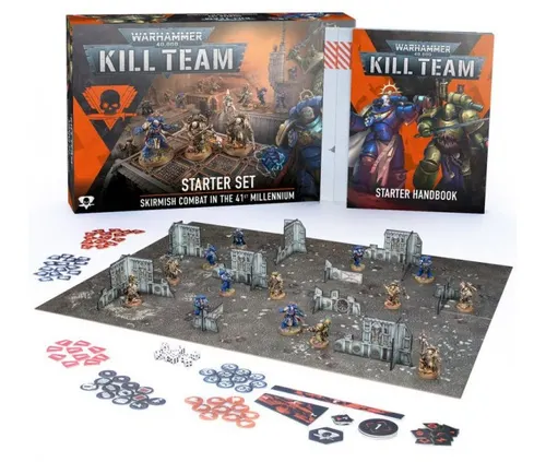 Dette sæt “Kill Team: Starter Set (103-54)” er designet til nye spillere, der ønsker at begynde med Kill Team i Warhammer 40.000-universet. Sættet indeholder 12 push-fit miniaturer fordelt mellem Space Marines og Genestealer Cult, et startregelsæt, terninger, målebånd og en spilleplade. Miniaturerne leveres med passende Citadel baser og er umalede.