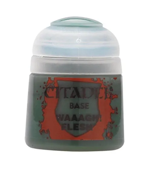 Citadel Base “Waaagh! Flesh” er en akrylmaling på 12 ml, der giver en dyb og dækkende grøn basefarve. Den er ideel til orker, gobliner og andre grønhudede væsener, hvor den danner et solidt grundlag for lysere grønne highlights. Malingen har en glat konsistens, høj pigmentering og kan fortyndes med vand for lagvis påføring.